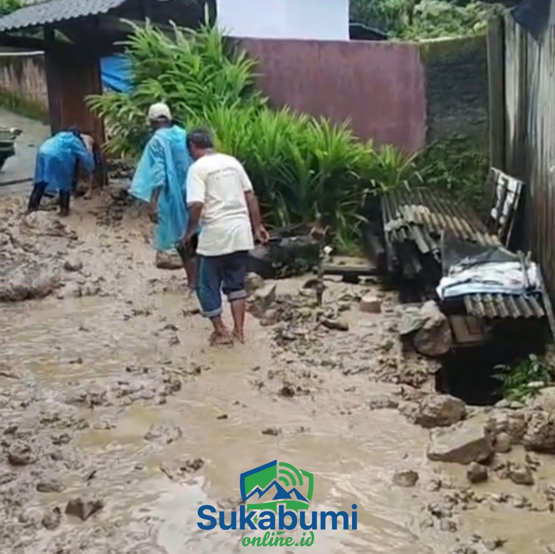 Material longsoran dari kawasan perumahan yang berada di dataran lebih tinggi mengalir tanpa kendali, menghantam bangunan semi permanen dan menimbun fasilitas milik warga.
